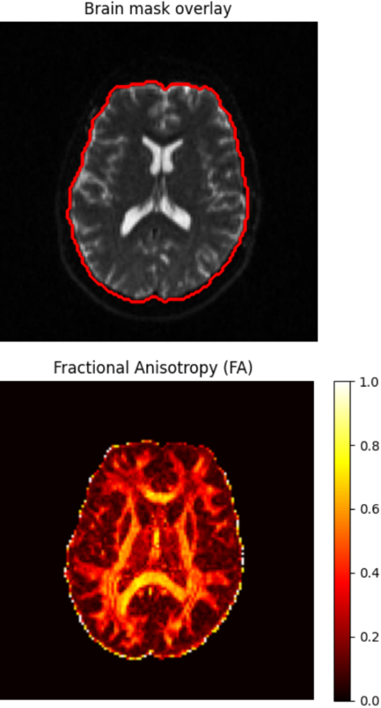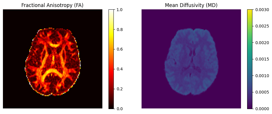 Diffusion tensor modeling using DIPY to compute standard microstructural maps including Fractional Anisotropy (FA) and Mean Diffusivity (MD).