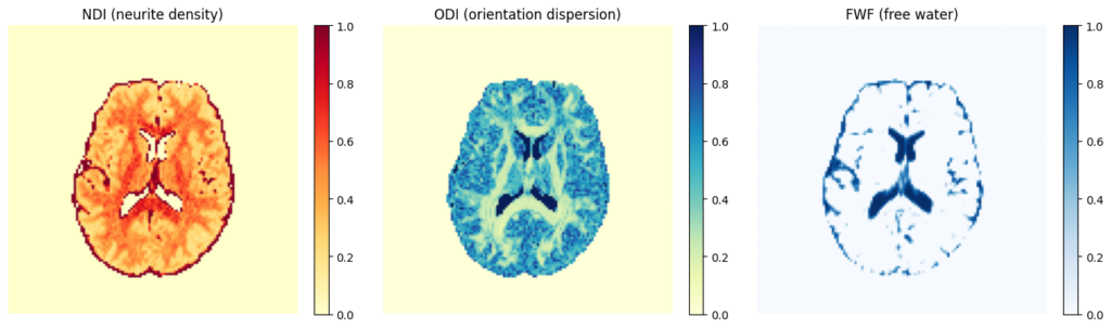 NODDI (Neurite Orientation Dispersion and Density Imaging) estimation using AMICO to extract biophysically-informed metrics of white matter microstructure.