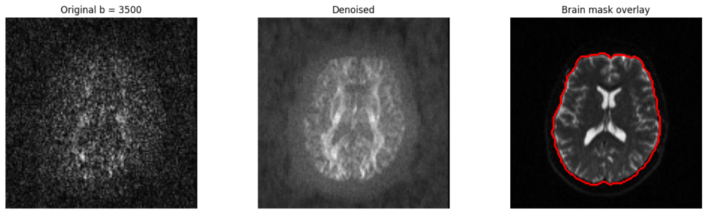 Self-supervised denoising via Patch2Self (DIPY) and deep learning-based brain extraction using HD-BET, with support for both single-subject and batch processing.