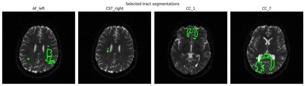 Automated white matter tract segmentation via TractSeg using CSD peaks computed with DIPY (rather than MRtrix) to maintain a Python-native implementation.