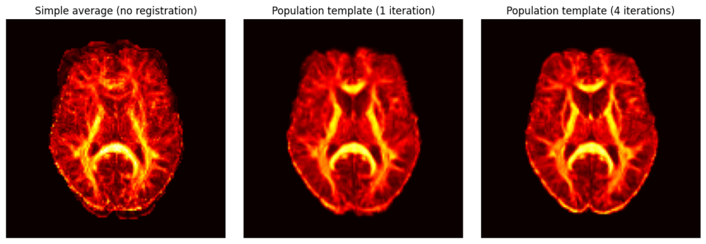 - Single-metric template building: Construction of unbiased population templates following the ANTs iterative template-building approach. Each iteration registers all subjects to the current template using symmetric normalization (SyN), averages the warped images to form an updated template, and applies shape averaging to ensure the template remains unbiased with respect to the input population. Uses a single scalar map per subject (e.g., mean b0, FA or MD).