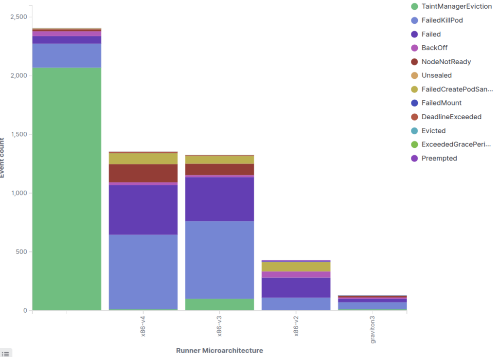 A Fluent Bit daemon runs on every Kubernetes pod and pushes logs to an OpenSearch cluster running in AWS. We can then use OpenSearch Dashboards to explore these logs, parsing them and then making visualizations out of them (see example below) to gain further insight into cluster operations.