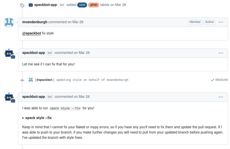Spackbot is a GitHub robot that helps coordinate Spack development. Upon opening a PR, Spackbot will apply relevant labels to it and attempt to notify the correct maintainer for review. During iteration on the PR, a developer can interact directly with Spackbot on GitHub via a list of commands, such as “@spackbot fix style” or “@spackbot re-run pipeline” to run autoformatting and restart a GitLab pipeline, respectively.