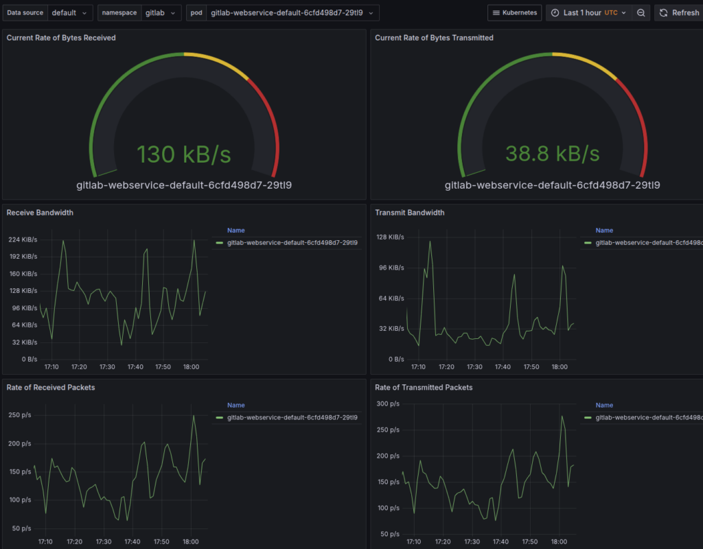 Figure 4: Grafana dashboards visualizing CPU, memory, and pod-level metrics collected by Prometheus, enabling real-time observability of Spack’s Kubernetes-based CI infrastructure