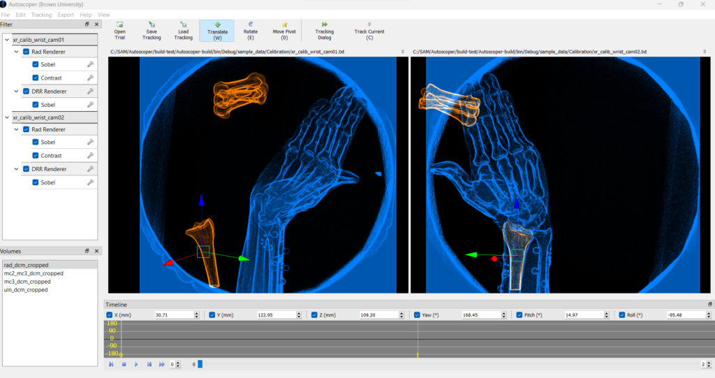 Autoscoper performs markerless 3D tracking of rigid bodies by registering CT-derived bone models to time-synchronized videoradiography images. Tracking is most commonly performed using biplane videoradiography (BVR), though single- and multi-plane configurations are supported.