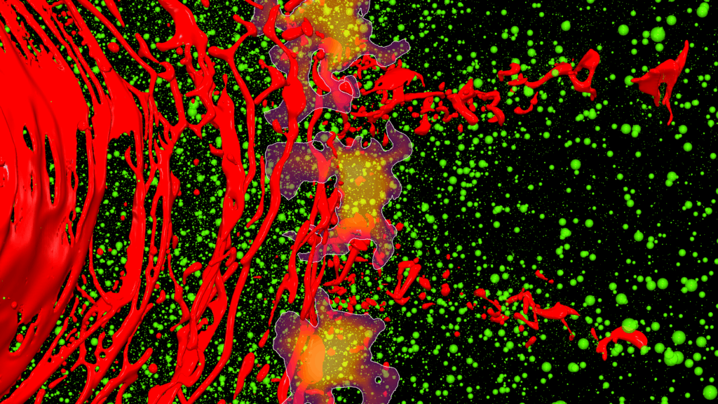 Figure 3: Top-down view showing how wide jet spacing allows red ligaments to pass through, while regions in contact with the jets are well atomised and form spherical droplets early.