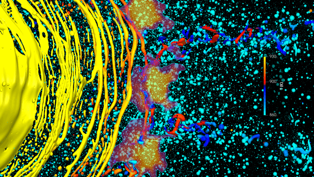 To guide the reader and viewer, it is often useful to start with an overview of the entire setup. Here we use the previously discussed STL files of the equipment components to illustrate the geometry and spatial arrangement. At the centre is the metal spray, coloured by the temperature distribution of the molten alloy. A black background enhances visibility, ensuring that even the smallest droplets and ligaments stand out clearly.