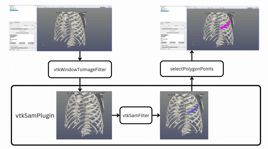 The SAM plugin can be broadly divided into two main components. The ParaView side handles two essential steps: capturing the rendered image together with the inference point, and applying the resulting selection back onto the 3D dataset. Between these two steps, the VTK-SAM component computes the segmentation mask from the rendered image and the user input. To keep the pipeline as simple and efficient as possible, we rely on existing ParaView/VTK utilities such as vtkWindowToImageFilter to convert the rendered view into a vtkImageData, and selectPolygonPoints, which allows selecting points on the rendered image from a polygon passed as an argument. The latter is particularly advantageous, since it enables VTK-SAM to directly leverage the full range of ParaView’s selection features, such as add, delete, toggle, grow selection, and many others.