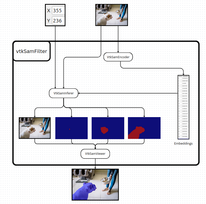 The vtkSamEncoder filter preprocesses an image and calls the ViT encoder (provided as an ONNX file). Its output embeddings are then passed to vtkSamInferer, along with the input point and the original image, to generate three masks. These masks can then be applied to an image and visualized with a third filter, vtkSamViewer. For ease of use, this entire pipeline is wrapped into a higher-level filter, vtkSamFilter. To optimize performance, vtkSamEncoder maintains a hash of the last processed image so that the encoding step is only recomputed if the image changes. Since image encoding is the most computationally expensive step, this significantly reduces runtime.