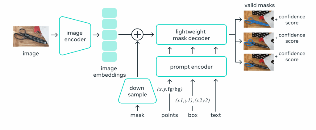 One of them gained a lot of attraction recently, Segment Anything (SAM) [5]. It enables efficient and accurate free-form segmentation of objects or regions within an image. From the user input (either a single click/point, a rectangle), the model will automatically segment the corresponding area in the image. SAM architecture consists of three main components: